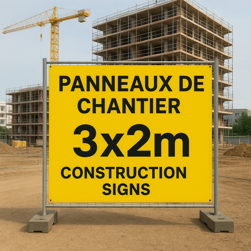 Calculez votre devis pour commander l'impression en ligne de panneaux de chantier 3x2m sur mesure.